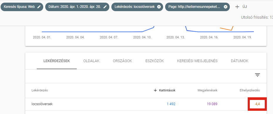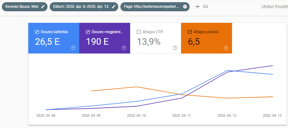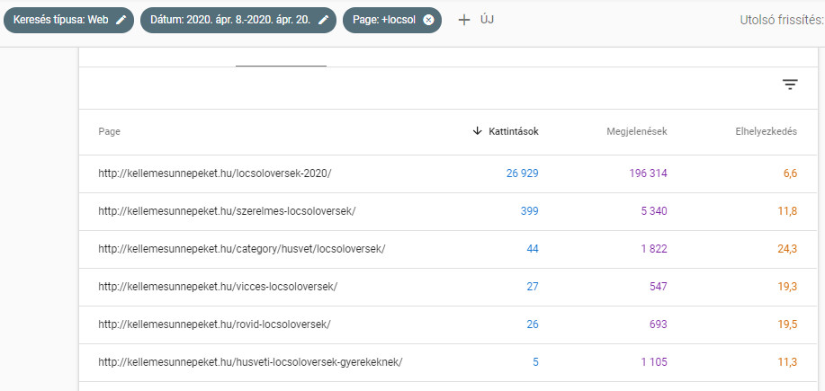 Ami nagyon jól mutatja, hogy milyen jól sikerült a kulcsszót kiválasztanom, az az, hogy ugyanebben az időszakban a többi locsolóverses cikk hogy szerepelt. A többi locsolóverses cikk korábban lett publikálva, mégis összesen csak kb. 500 kattintást hoztak, míg a locsolóversek 2020 pedig több, mint 26.000-t!!!